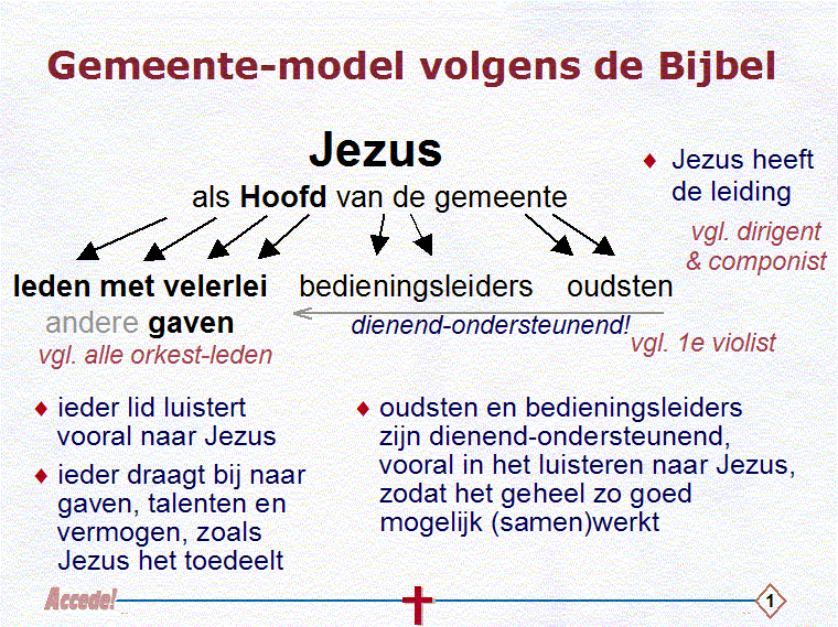 Ik vergelijk het functioneren van een gemeente wel met een groot orkest. Een mooie uitvoering ontstaat, wanneer ieder speelt wat de Componist bedoelde en goed let op de Grote Dirigent. Menselijke leiders spelen hooguit een rol als van de eerste violist(e), die de samenwerking tussen Dirigent en orkest wat helpt te stroomlijnen. Het resultaat is dan een harmonieuze en verheffende muziekuitvoering.